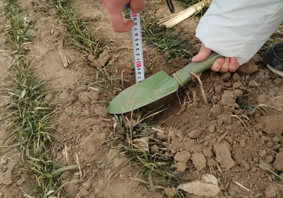 目前小麦地上部叶片青枯程度要高于往年,绿叶长度平均不足1厘米,干土层厚度3-5厘米,但大部分地块小麦分蘖节处于冻土层中,茎部萎蔫情况发生较轻,苗情总体正常。考察中也发现个别地块干土层超过7厘米,茎部萎蔫度偏重,主要原因有3个方面:一是部分复耕复垦地耕作层有石块,土壤不够紧实;二是播种质量差,播种较浅或播种后拖拉机车轱辘压碾导致小麦分蘖节处于干土层;三是播种后没有浇好苗期水或越冬水。
