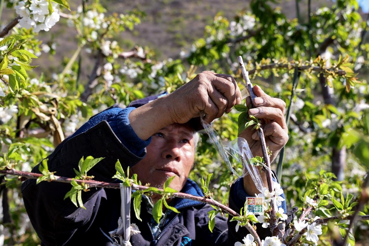 顺义区龙湾屯镇山里辛庄村果农嫁接樱桃树精益求精