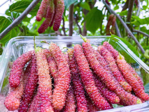 它的味道清甜多汁,采摘和食用时也不会轻易染手汁液颜色,深受年轻人喜爱。桑葚含有十六种氨基酸、七种维生素,还有果糖、果胶、微量元素等人体必需的营养物质,被医学界称之为“人体血库”。而台湾长果桑除了一般桑葚的功效外,其特别之处在于果实中维他命A、B1、B2、C、铁、钙的含量比较高。