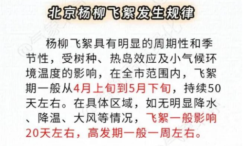 4月2日,北京发布今年首个杨柳飞絮预报,其中提到北京最先飞絮的白毛杨主要分布在五环内,各区域飞絮始期预计为:中心城区:4月3日~5日;;城区西南部:4月4日~6日;城区东南部:4月4日~6日;城区东北部:4月5日~7日;城区西北部:4月5日~7日。
