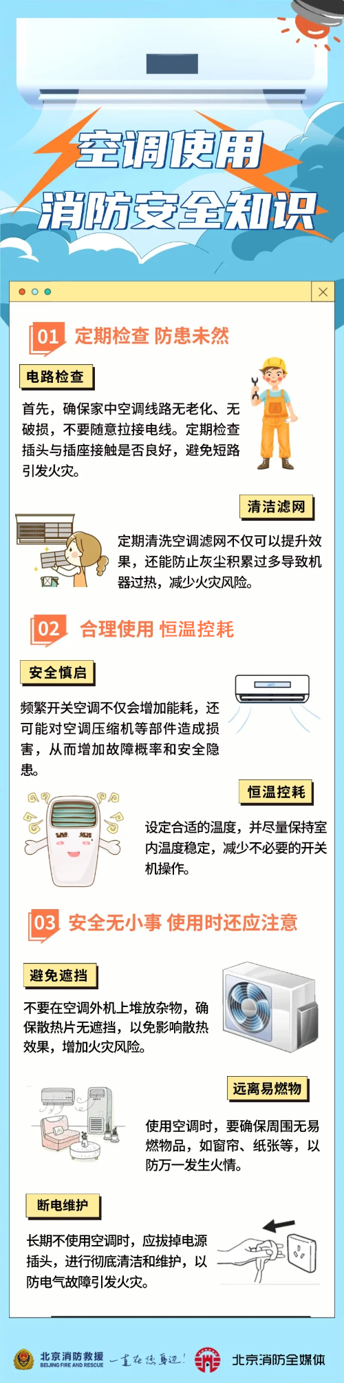 立夏之后气温升高,空调消防安全不容忽视。高温天气下,空调超负荷运转易引发火灾,建议定期检修设备确保用电安全。更多安全知识请看下方提示。