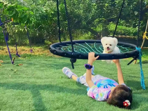 趣味体验:樱桃林间无动力滑梯|草坪秋千|萌宠乐园(孔雀/松鼠/柯尔鸭/小羊)